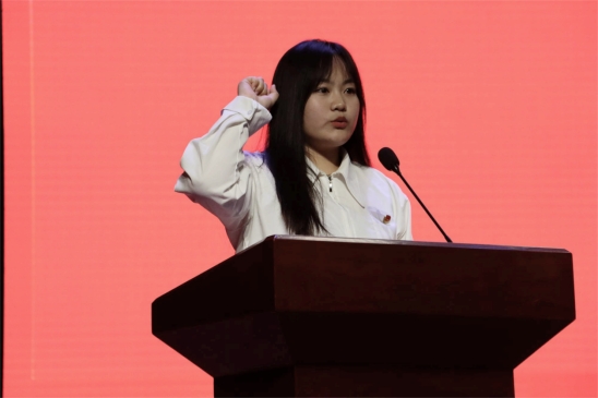 新团员代表马艳发言并号召全体新团员说到:“从104年前五四运动开始,青年的身影不断出现在历史舞台上,为当时积贫积弱的祖国贡献出自己的力量;到了今天,山河犹在,国泰民安,生逢盛世而身为“后浪”的我们更应有所作为,我辈青年,以创新为刃,划破茧壳。扮相儒雅,谈笑大方,一唱一转间焕发青春的光彩。”
