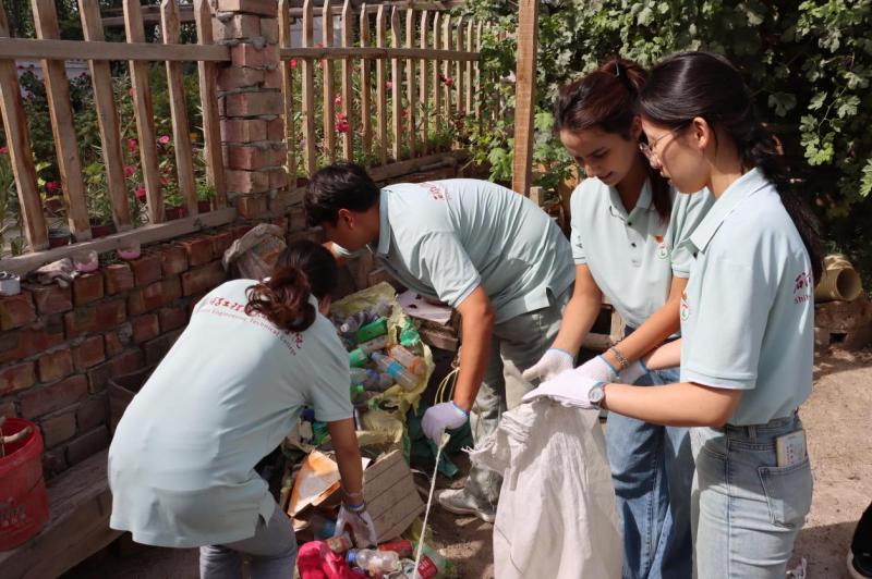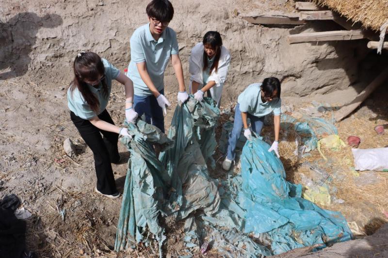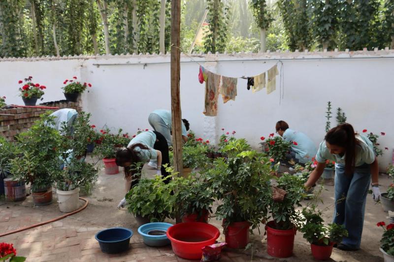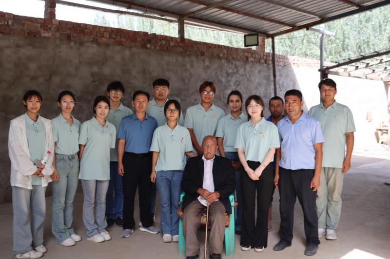 随后,实践团的走访慰问小分队在简基松同志的带领下,来到了布拉克苏乡吐尔恰巴格村一位有着55年党龄的老党员家里,开展志愿服务活动。大家拔草、清理垃圾、整理庭院、与老党员同志亲切交流,并送上大米和面粉等慰问品,老党员同志的家人也热情地接待了大家。