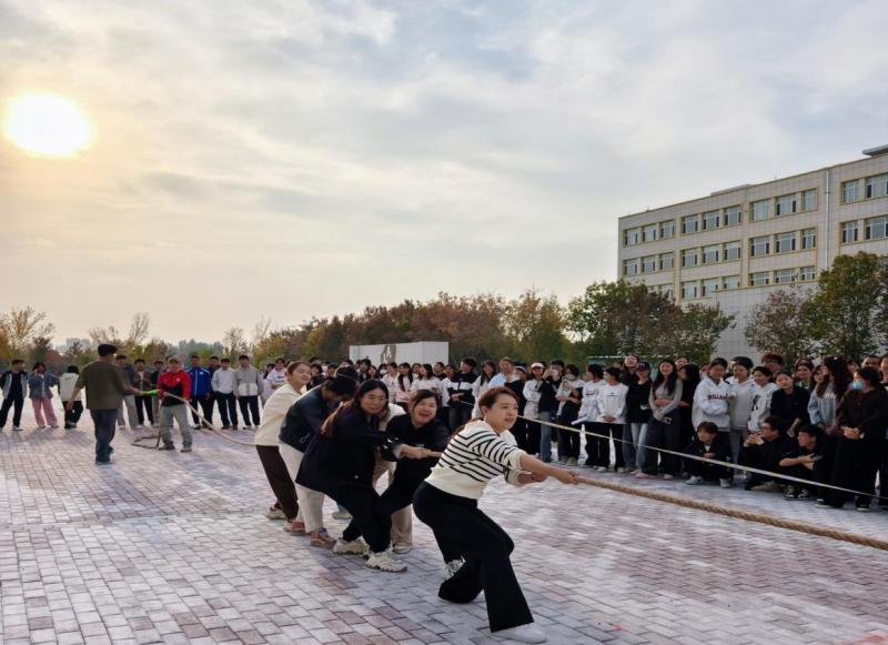在柔和的斜阳中,人文社科系教师们也参与到拔河比赛中,进行了一场别开生面的比赛。当哨声响起,老师们斗志昂扬,充满了青春活力,同学们在旁边为老师们加油呐喊着,整个场面既激烈又温馨。