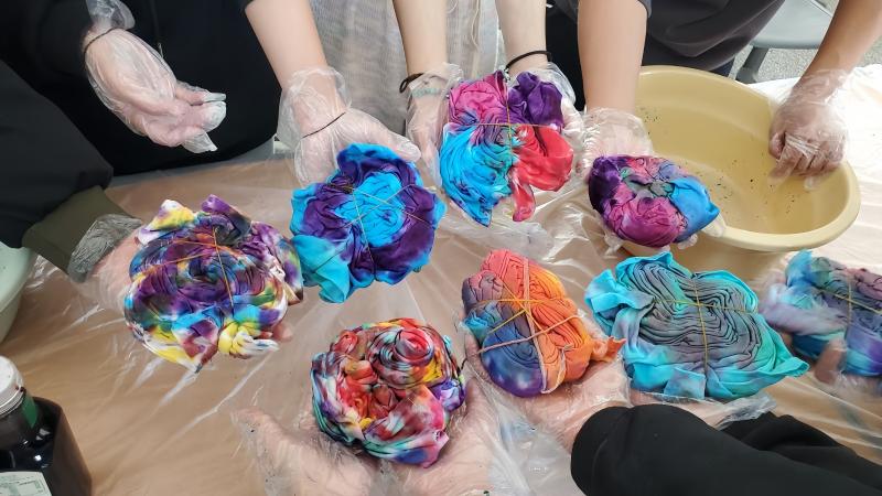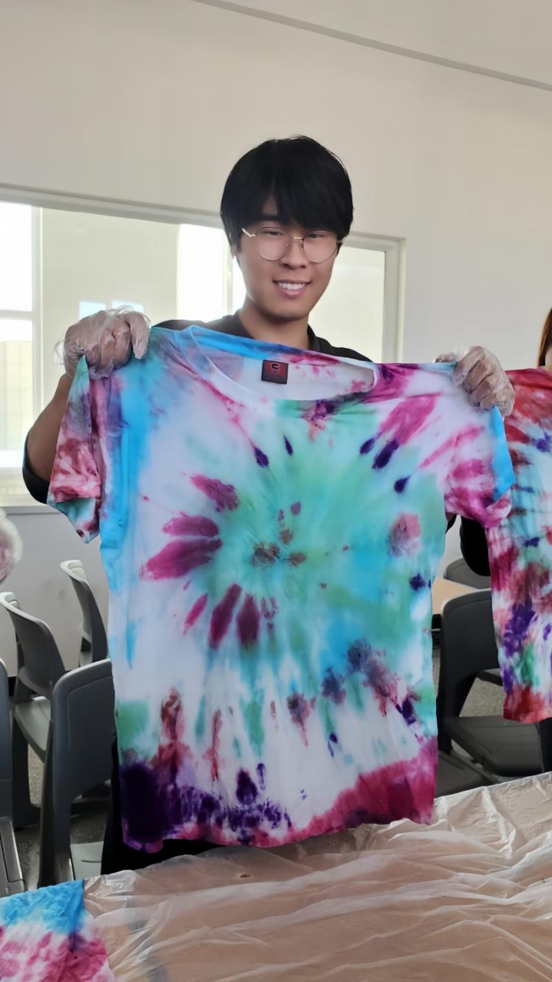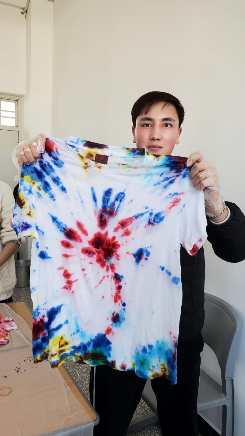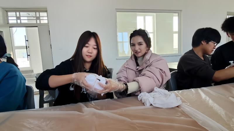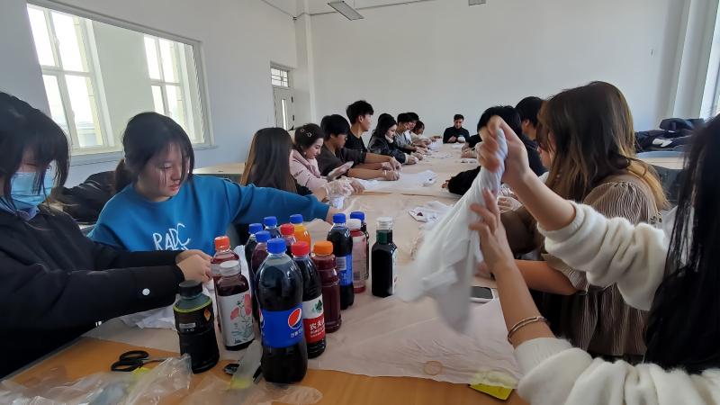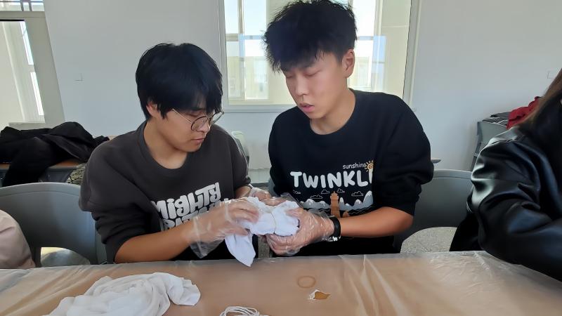 活动伊始,建筑工程系教师辛欣向同学们介绍了扎染的文化传承价值,现场演示了扎染的步骤。在老师的指导下,同学们佩戴好防护手套、围裙等防护用品,用染料、绳子、针线、橡皮筋等材料开始动手实践。过程中,同学们互相帮助、交流心得,现场氛围热烈而有序。